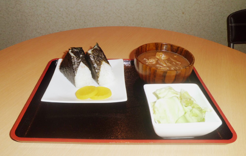 お手軽だけど、豚汁もキャベツサラダも付いてボリューム満点おにぎりセット。
