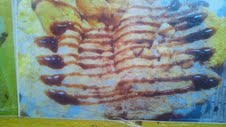 溶いた粉をお好み焼きのように薄く引き延ばし、イカを入れ、上下から鉄板でプレスして焼きあげます。ソース&マヨネーズを塗って2つ折りにして出来あがり!!