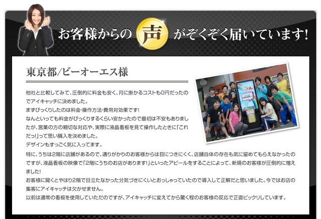 なんといっても料金がびっくりするくらい安かったので最初は不安もありましたが、営業の方の親切な対応や、実際に液晶看板を見て操作したときに「これだっ!」って思い購入を決めました。