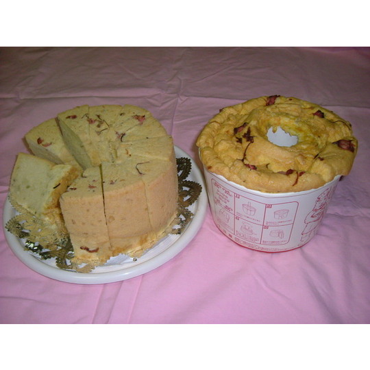 バラの花びら(食用のバラの花)のお茶と、バラのジャムを使いバラの香り豊な優雅なシフォンケーキです。