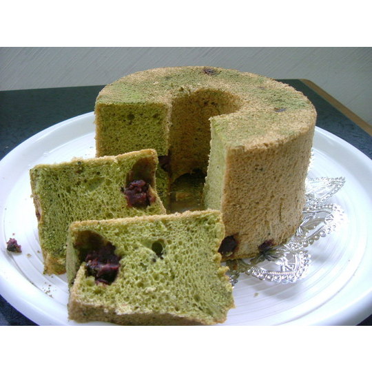 和風のティストで生地全体を抹茶味にし、相性の良いあづきを加え、ふわふわに焼き上げたシフォンケーキです。