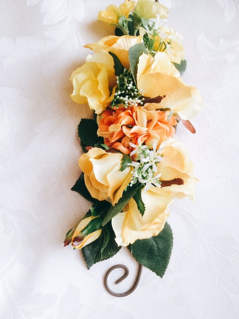 山茱萸(さんしゅゆ)を主材にキレイなオレンジのラナンキュラスと、緑の葉っぱは『水菜』ではございません(笑)『飛竜シダ』です。