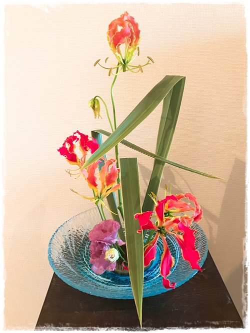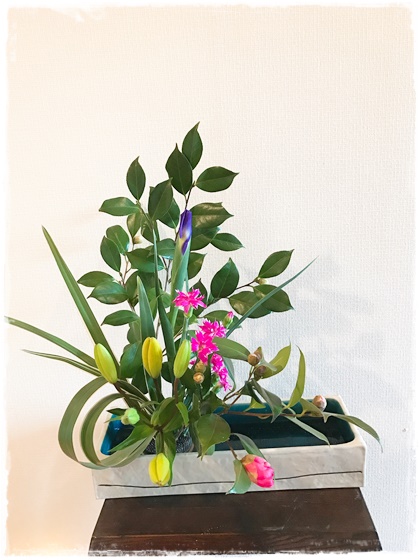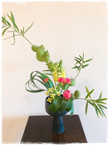 生徒さん持ち込みの花器でいけばな。