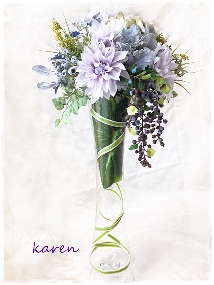 この時期ならではのパンパスグラスとハスの実にりんどう、スケシユリ、青ドラセナ、スプレーカーネーションの取り合わせ♪