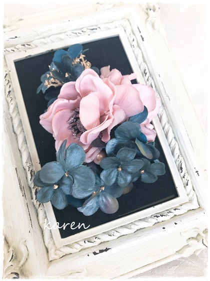 ピンクのアネモネと深みのあるブルーの大人~なコサージュです♪