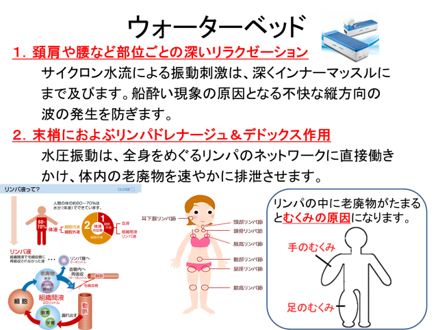 ローラーと比べ水特有の柔らかい刺激を与えることができ、心地よさを体感することができます。 また、全身をマッサージするため筋が柔らかくなります。