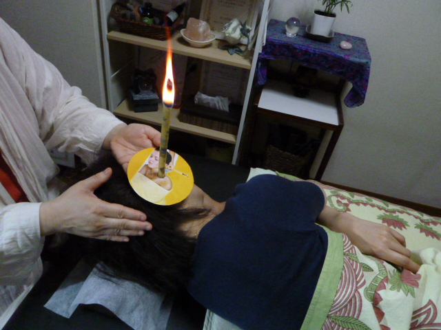 耳にキャンドル(蜜ろうがしみ込ませてある、中が空洞になった布の筒)を刺し込み、その反対側の先端を燃やしていきます。