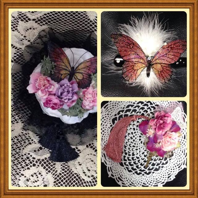 花とラメ入りの蝶々をあしらった新しいかたちのコサージュ。