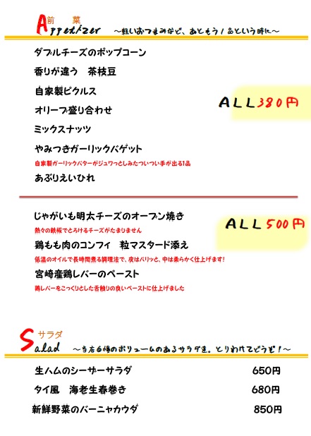 お手軽価格の前菜と、オリジナルドレッシングが大人気のシーザーサラダやバーニャカウダなどのメニューです!