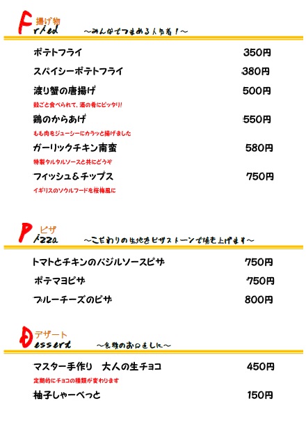 みんなでつまめる揚げ物やピザ!ピザはピザストーンを使って焼きあげる手作り生地です。マスターがつくる生チョコは隠れた人気メニュー!