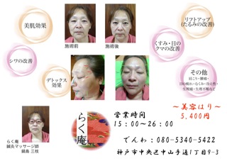 美顔効果・しわの改善・くすみ、目のクマの改善そして、リフトアップ!などなど一度体験してみませんか?効果は個人差があり・・・[ 続きを見る ]