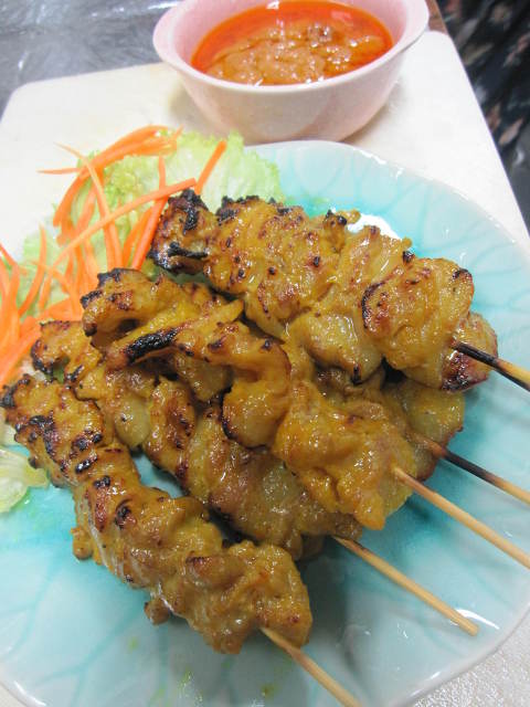 タイ式豚肉の串焼き・ピーナツソース添え ビールによく合う人気のメニューです。 一皿6本