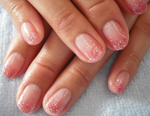 爪への負担の少ないジェルネイルを使用し、キラキラのラメで爪の先端からグラデーションにしていきます。