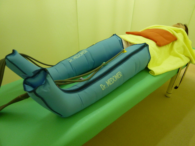 太もも~ふくらはぎの筋肉を包み込んで空気が入ったり抜けたりします。言うならば血圧を測るときのような感覚です。